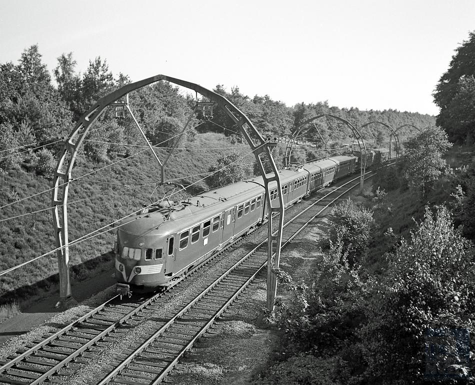 Zwaluwenberg, 12 augustus 1965. Treinstellen 623 en 355 op weg van Utrecht via Hilversum naar Amsterdam. Foto: J.C. de Jongh.
