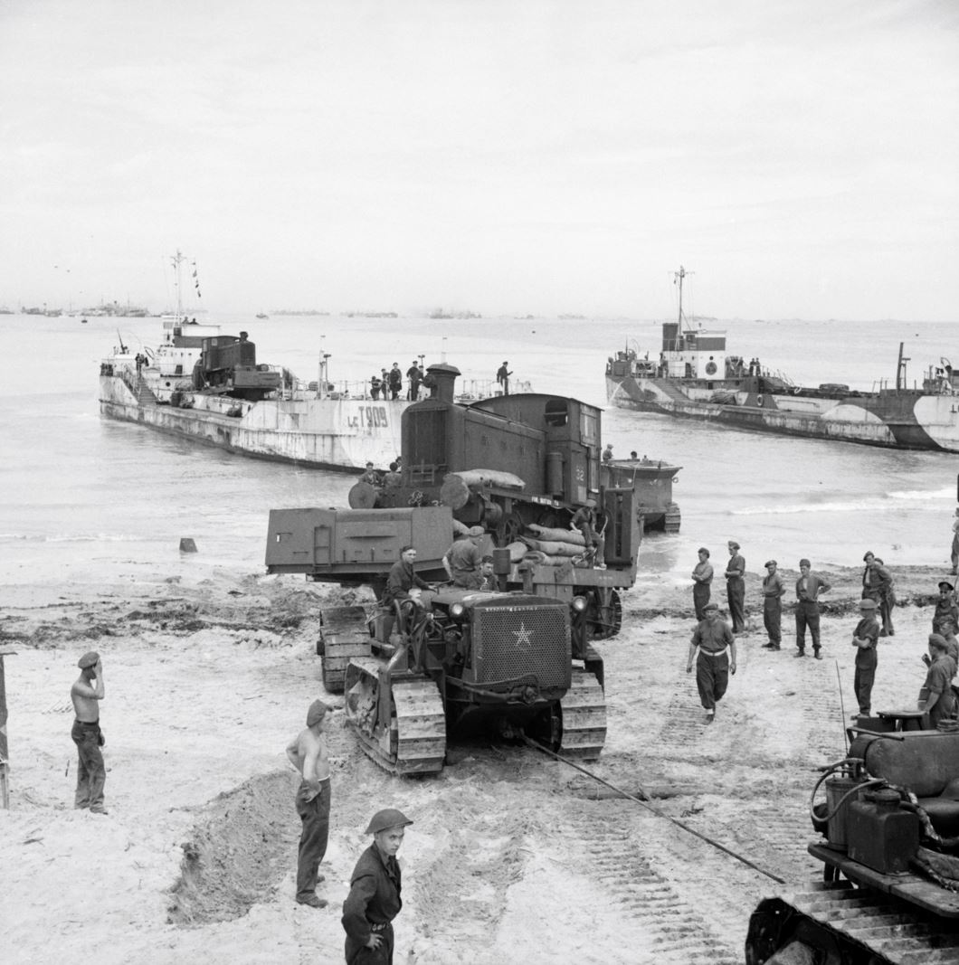 Landing van WD diesellocomotieven op het strand van Normandië, 26 juli 1944.
