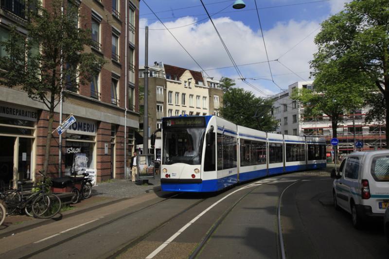 Lijn 10 van het GVB op de kruising van het Van Limburg Stirumplein en de Van der Hoopstraat in juni 2018. (foto: Karel Hoorn)