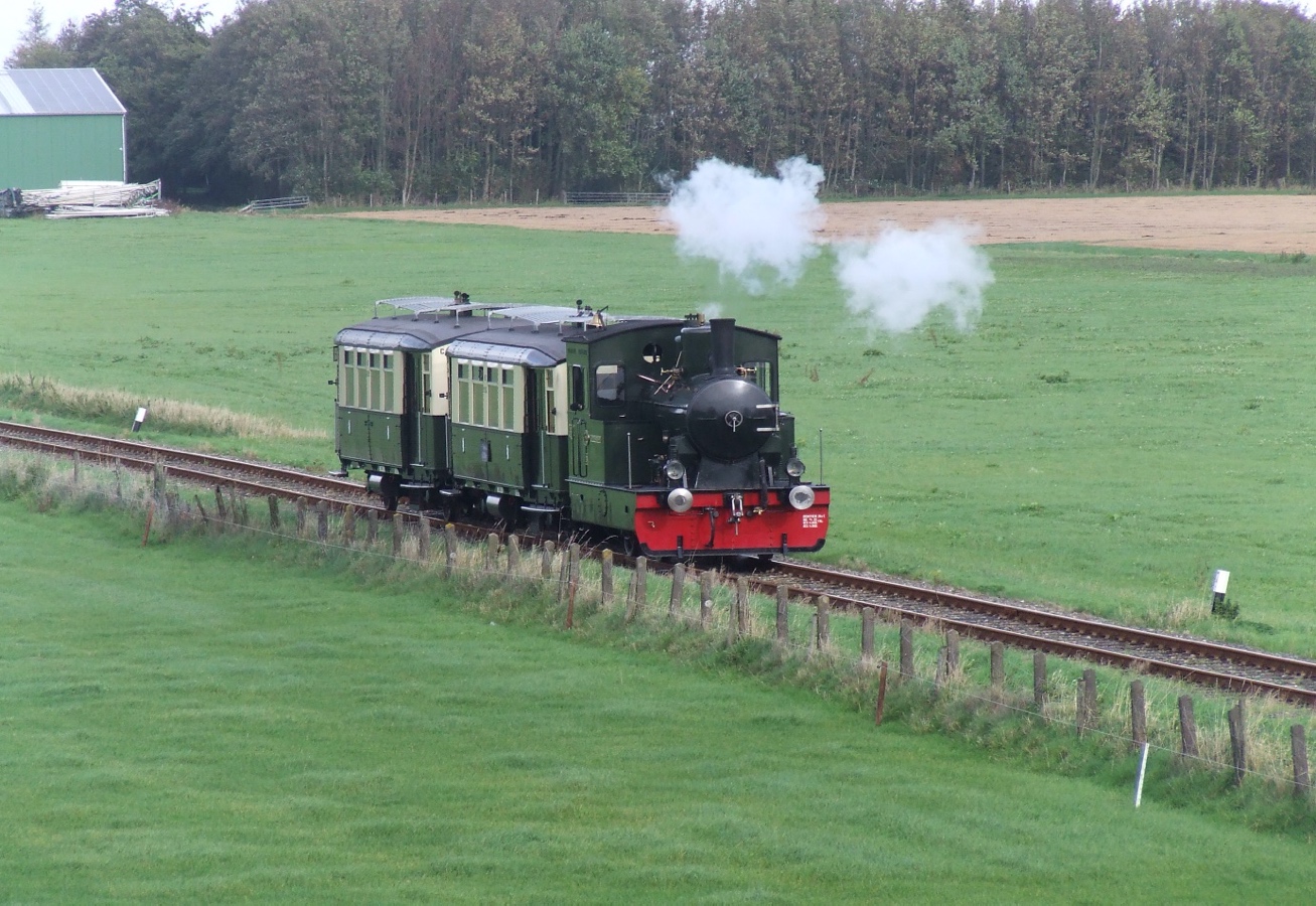 “Stoomdiesel”, vanwege een mechanisch defect werden de omC’s 909+910 van de Stoomtrein Goes-Borsele getrokken door stoomlocomotief NS 8302, of was het toch de LTM 26? Tussen Benningbroek en Wognum, 29 oktober 2023.