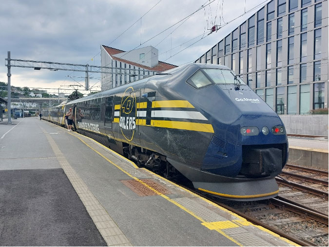 Een trein van GoAhead Nordic staat te Kristiansand gereed voor vertrek naar Stavanger op donderdag 27 juni 2024 (foto: Dènis Baarends)