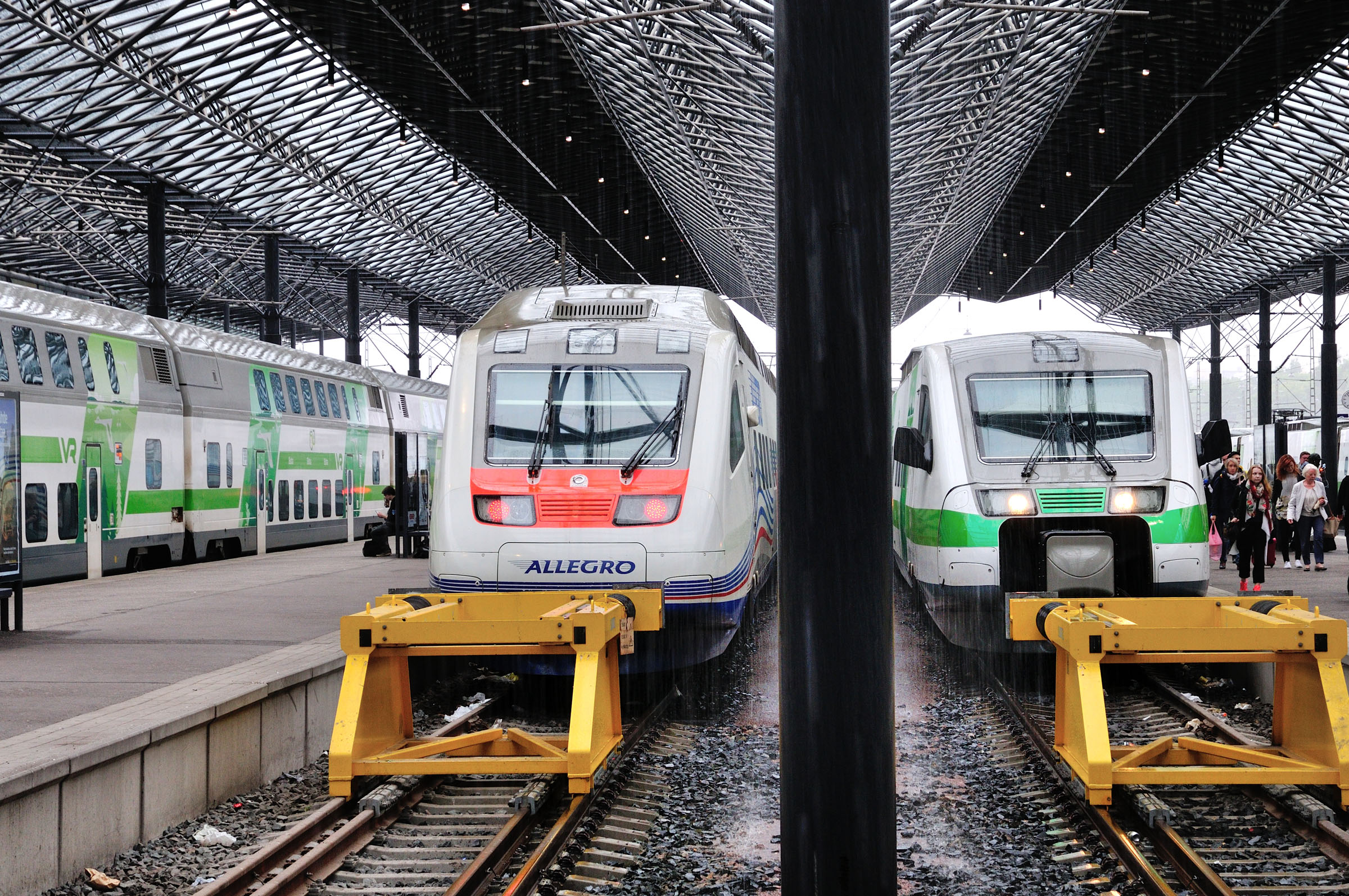 Allegro hogesnelheidstrein naar Sint Petersburg (l) en een Finse Pendolino in het hoofstation van Helsinki. Foto Sjoerd Bekhof.