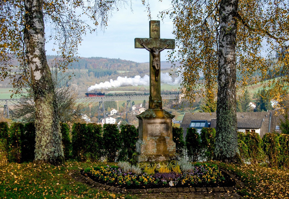 Tanago Foto- und Eisenbahnreisen organiseerde op 26 en 27 oktober 2019 fotoritten met loc 50 2988 (op 27 oktober als 052 988) van de Dampflokfreunde Schwarzwald-Baar e.V. over de ‘Sauschwänzlebahn’ (Wutachtalbahn) Weizen – Fützen – Blumberg Zollhaus. Na het maken van de tegenlichtopnames stond er in de ochtend van 27 oktober 2019 een flinke wandeling op het programma, naar de ‘zonkant’ van het Epfenhofener-viaduct. Hier maakte de trein maar liefst dertien schijndoorkomsten over het viaduct. De vijfde werd gefotografeerd vanuit de begraafplaats van Epfenhofen. Op de zondag voor allerheiligen zijn er niet alleen spoorwegfotografen op de begraafplaats: ‘Epfenhofen ehrt seine Toten, aber die Sonntagsmorgenruhe wird rüde von der hin und her über der Brücke donnernde Dampflok zerstört!‘.