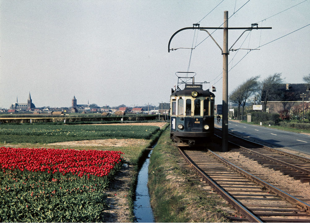 NZH-tram langs de bollenvelden bij Noordwijk aan Zee, 1957. Foto: Hans van Engelen.