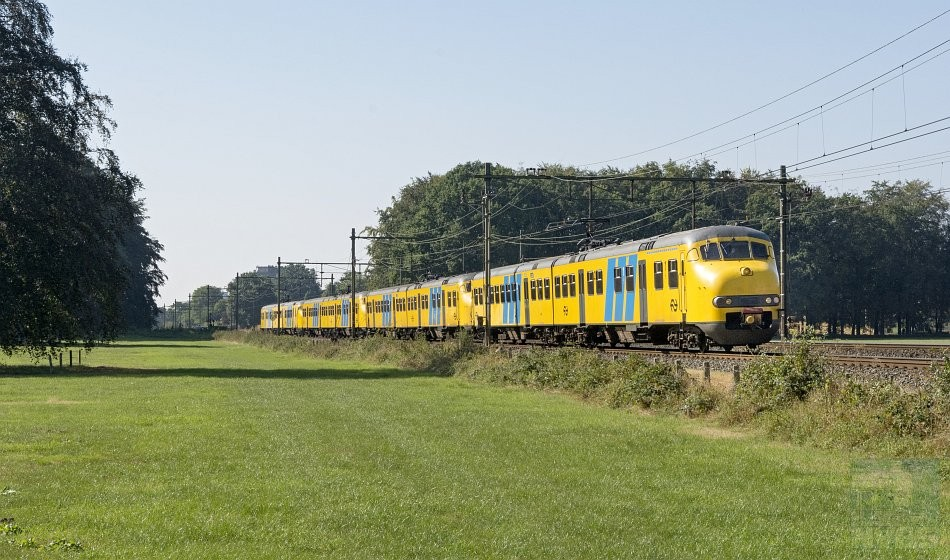 NS plan V 449, 469 en 466 en de 876 van het Spoorwegmuseum tijdens hun afscheidsrit onderweg naar Utrecht Maliebaan ter hoogte van Velp. Foto: Rob Dammers, 25-09-2016 (SNR)