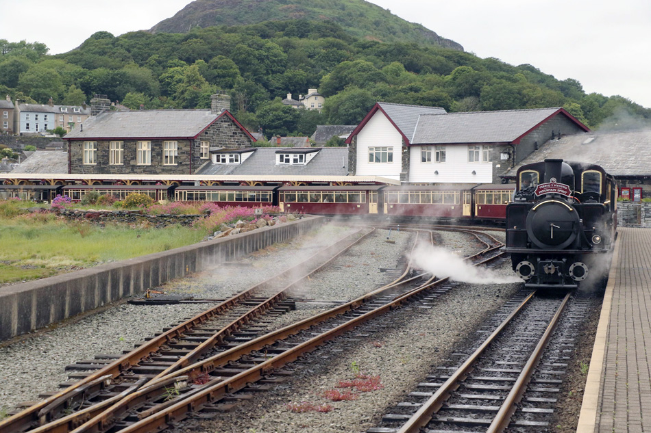 Een smalspoortrein van de Ffestiniog Railway inet het station Porthmaddog Harbour kort voor vertrek naar Baenau Ffestiniog op 10 juli 2024. Foto: Steven Hopman.