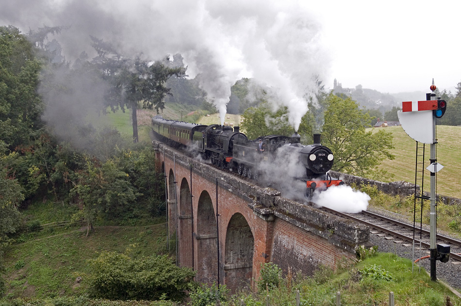 LSWR Drummond T9 ‘Greyhound’ 4-4-0 No. 30120 and Southern Railway Maunsell ‘U’ class 2-6-0 No. 31806 with a Bridgnorth to Kidderminster service on the Oldbury Viaduct.