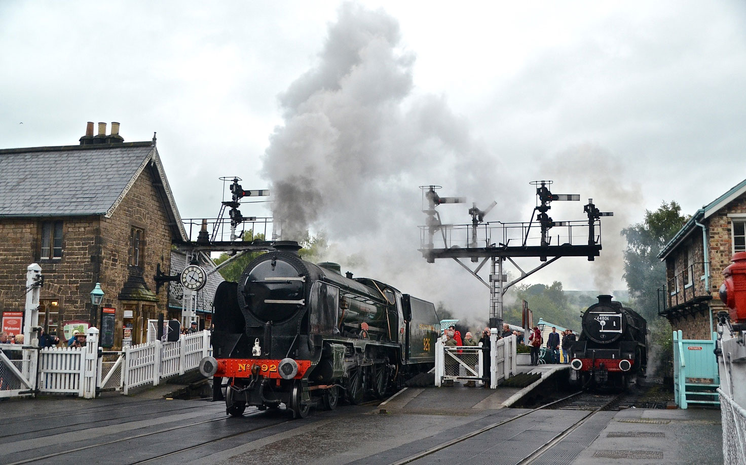 1 oktober 2017 NYMR Grosmont: De Southern No.926 vertrekt naar de yard en de loc 44806 staat klaar om de trein over te nemen.
