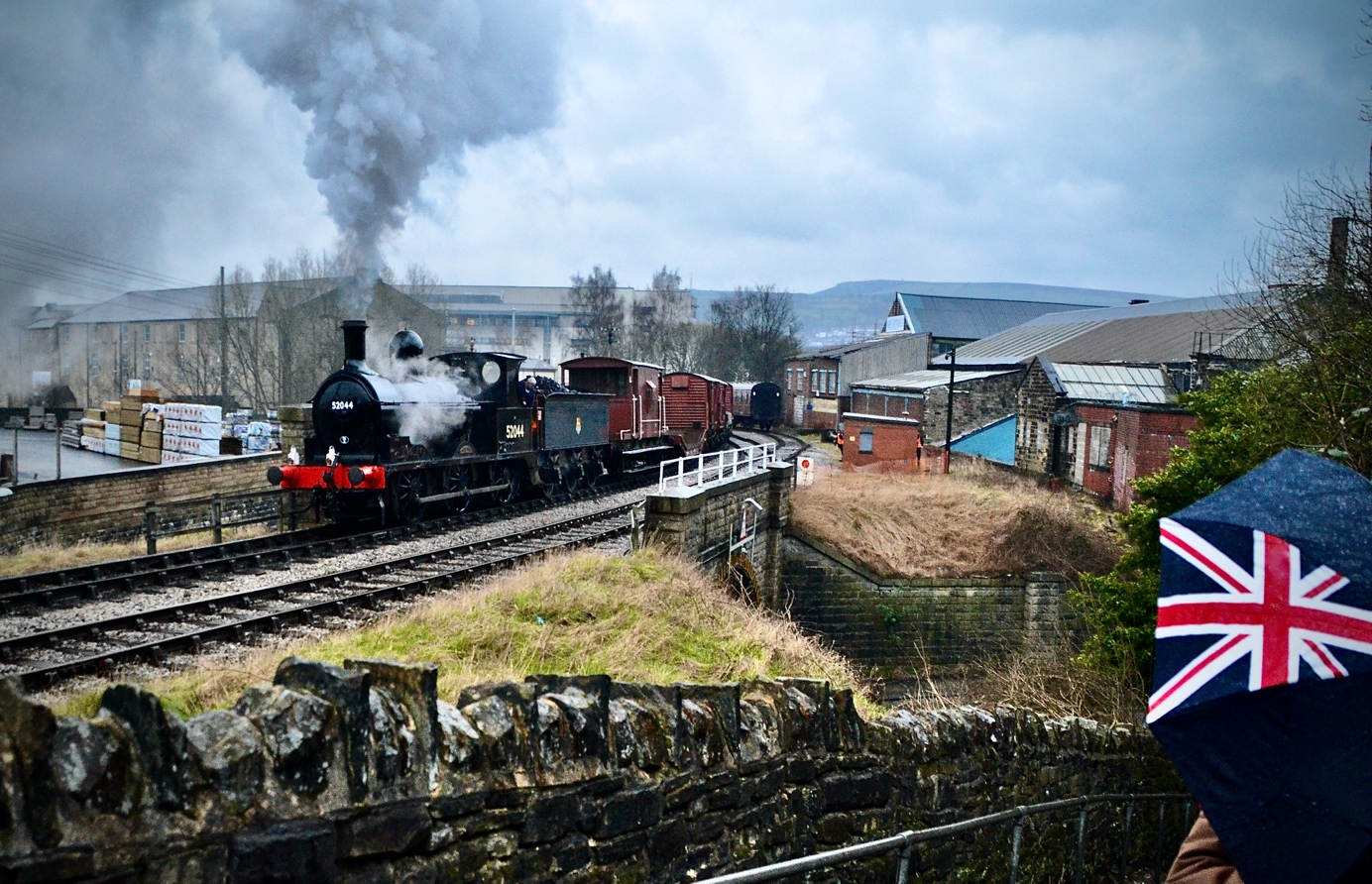 Het is echt regenachtig “Engels” weer als de loc 52044 met een goederentrein bij vertrek uit het station van Keighley wordt gadegeslagen. 11-maart-2022 17:43 uur.