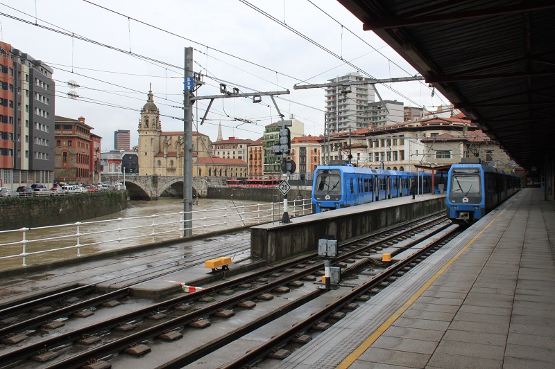 Twee elektrische treinstellen van de Baskische Euskotren aan het perron in Bilbao-Atxuri, 3 februari 2015. Foto: Erik van Lunteren.