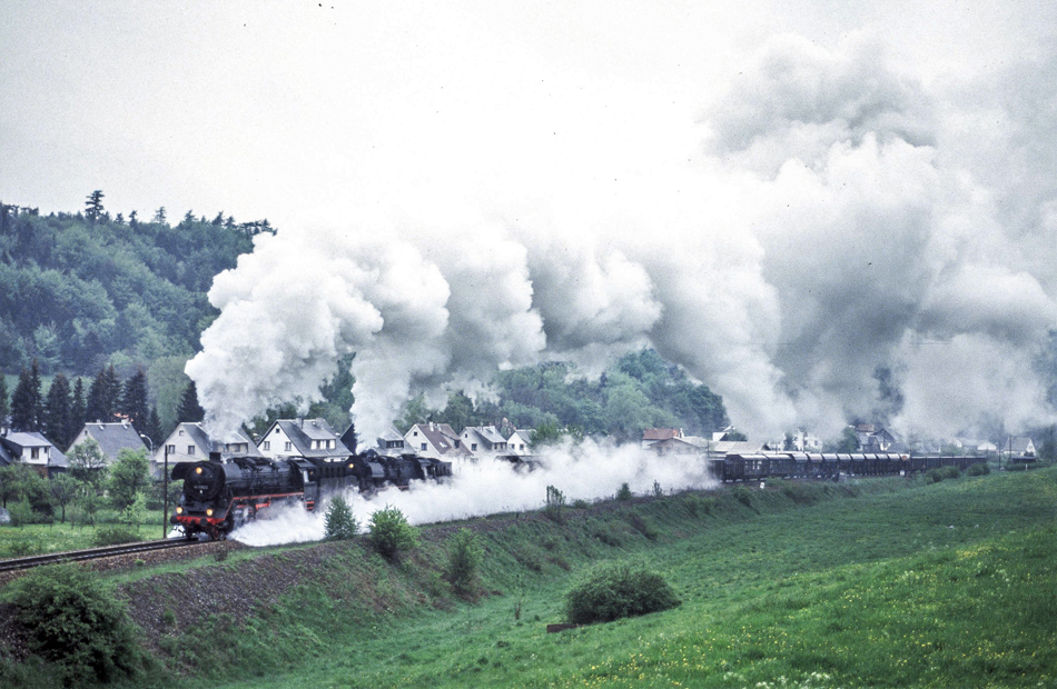 Van 6 tot en met 9 mei 1993 werd onder het motto ‘Frühlings-Plandampf in Thüringen’ een van de grootste Plandampfevenementen ooit georganiseerd. Klaus Wilmsmeyer had er zorg voor gedragen dat maar liefst ruim 10 loc’s met dienstregelingstreinen onderweg waren op de spoorlijnen van Erfurt-Meiningen, Erfurt-Bebra en Eisenach-Meiningen. Loc’s 44 1093 + 50 3688 van de DR hebben bij Gräfenroda alle moeite om trein Ng 64415 van Arnstadt naar Suhl over de Rennsteig te krijgen, 6 mei 1993.