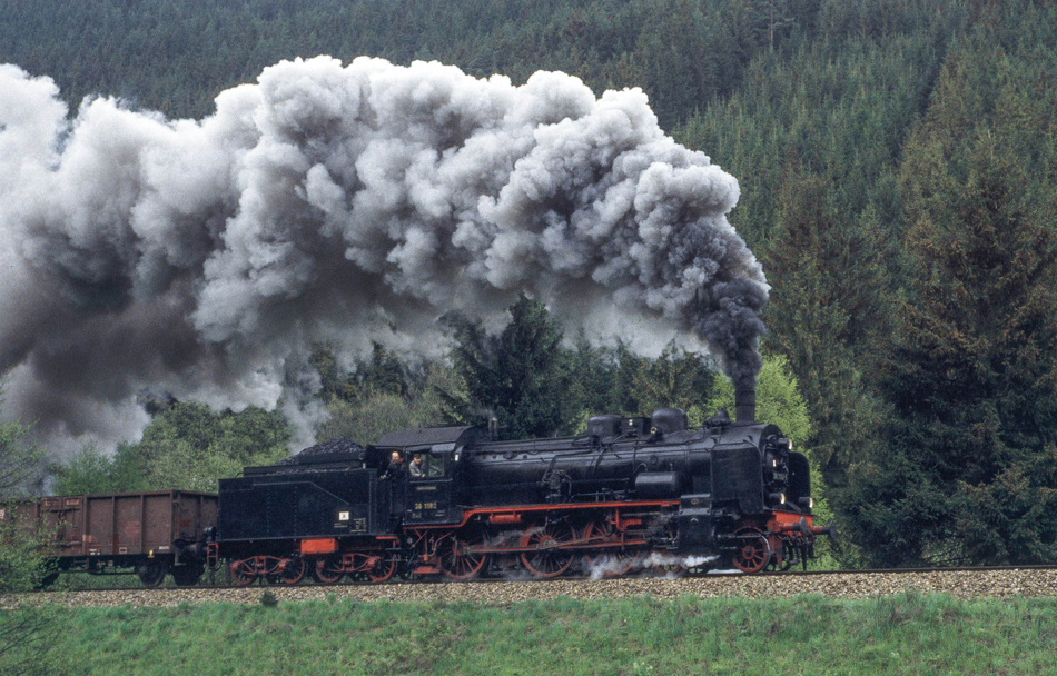 Van 4 tot en met 6 mei 1998 organiseerde IGE Werrabahn Eisenach e.V. een Plandampf op de later die maand (van Triptis naar Ebersdorf-Friesau) te sluiten Oberlandbahn. Onder het motto ‘Das Oberland voll von Dampf’ reden zes loc’s personen- en goederentreinen op de lijnen Saalfeld (Saale) – Gera, Triptis – Lobenstein – Blankenstein en Saalfeld (Saale) – Lobestein. Loc 38 1182 van DB AG is zojuist met veel bravoure vertrokken uit Lichtentanne met een (extra) goederentrein van Arnstadt via Saalfeld (Saale) en Würzbach (Thür) naar Bankenstein (Saale), 4 mei 1998.