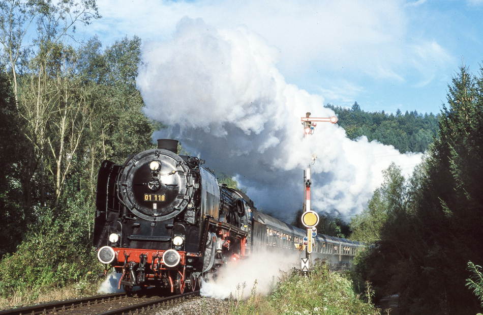De invoering van de starre dienstregeling in de Pfalz was voor het ‘Ministerium für Wirtschaft, Verkehr, Landwirtschaft und Weinbau’ van de deelstaat Rheinland-Pfalz, aanleiding om onder het motto ‘In der Pfalz: Tempo, Takt und Dampf’ vanaf 30 september tot en met 3 oktober 2000 (gratis) ‘Plandampf’ aan te bieden. Met vier sneltreinstoomloc’s en een aantal andere werden ‘im Taktfahrplan’ rondom het Pfälzerwald stoomtreinen gereden in de vierhoek Kaiserslautern – Pirmasens Nord – Landau – Neustadt an der Weinstraße en enkele zijlijnen. Meteen werd ook aangegrepen om te gedenken dat er 125 jaar treinen door het Queichtal reden en dat Plandampf in Duitsland 10 jaar bestond. Loc 01 118 van de Historische Eisenbahn Frankfurt is zojuist uit Pirmasens Nord vertrokken met trein RB 29515 naar Landau, 2 oktober 2000.