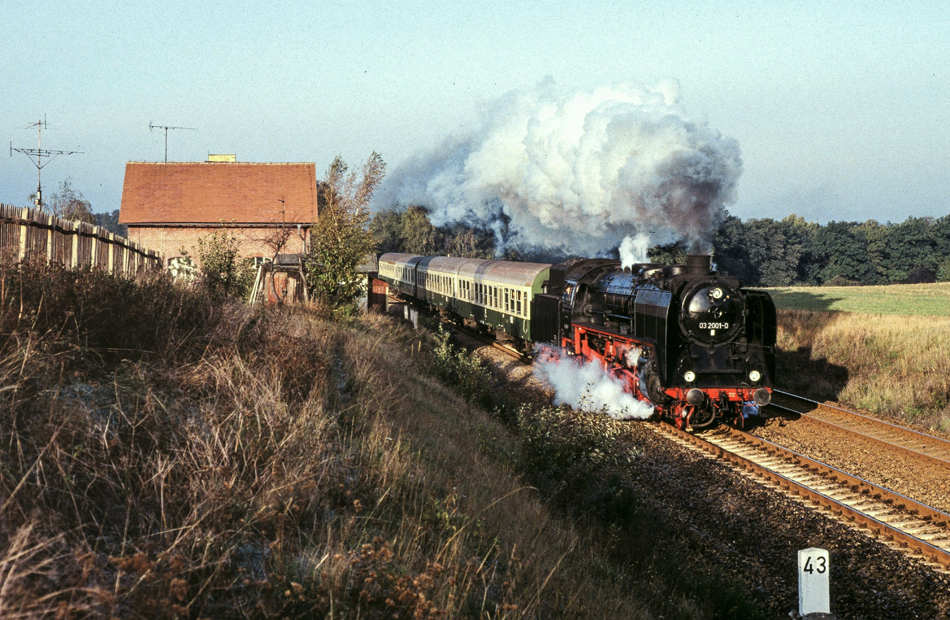 Onder het motto ‘Goldener Herbst in de Oberlausitz’ organiseerde de Sächsische Eisenbahn Gesellschaft van 17 tot en met 20 oktober 1992 een Plandampf in de Oberlausitz. In Jeßnitz rijdt loc 03 001 van de DR in alle vroegte met trein D 1851 van Dresden-Neustadt naar Görlitz, 17 oktober 1992. Foto: Bart van ’t Grunewold.