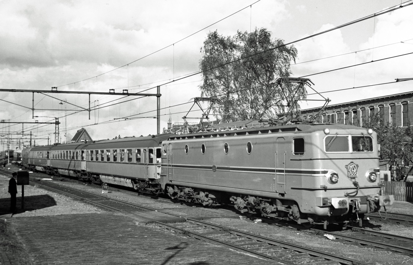 De nieuwe elektrische locomotief NS 1305 en rijtuigen ABd 7710, Cd 7829, restauratierijtuig RDd 7656 en postrijtuig Pd 7920 in turkooise kleurstelling bij binnenkomst te ‘s-Hertogenbosch voor een materieelshow, 11 oktober 1952. Foto: J.A. Bonthuis, collectie NVBS Railverzamelingen.