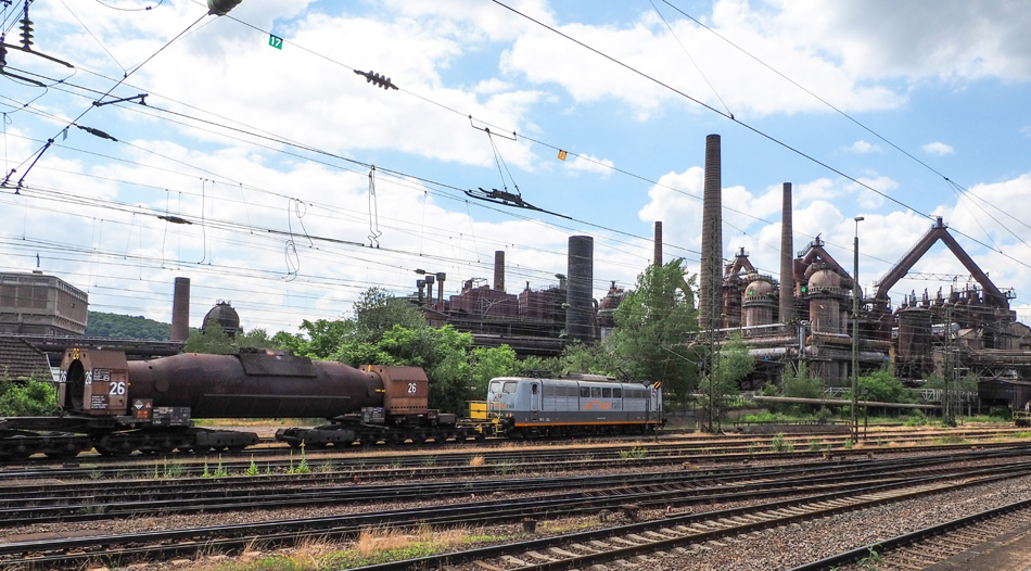 Torpedowagen 26 op vier vierassige draaistellen achter een loc Reihe 151 van Saar Rail. Op de achtergrond Unesco-werelderfgoed “Völklinger Hütte.” Foto: Rudi Liebrand.