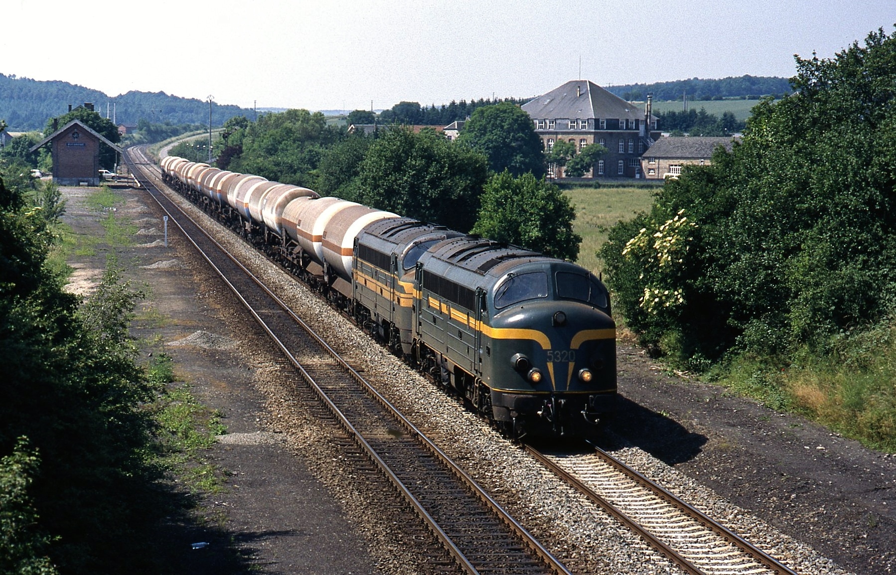 Twee ‘Bolle Neuzen’ van de reeks 53 op de Athus-Meuselijn ter hoogte van Wiesme in 1989. Foto: Bert van der Kruk.