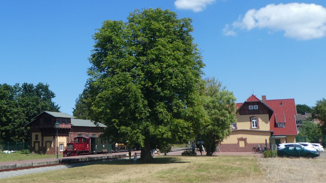 Locomotiefloods, trein en stationsgebouw van de Lütt Kaffeebrenner lijken nietig onder de enorme kastanjeboom. Foto Peter Doove. Lütz 28 juni 2023.