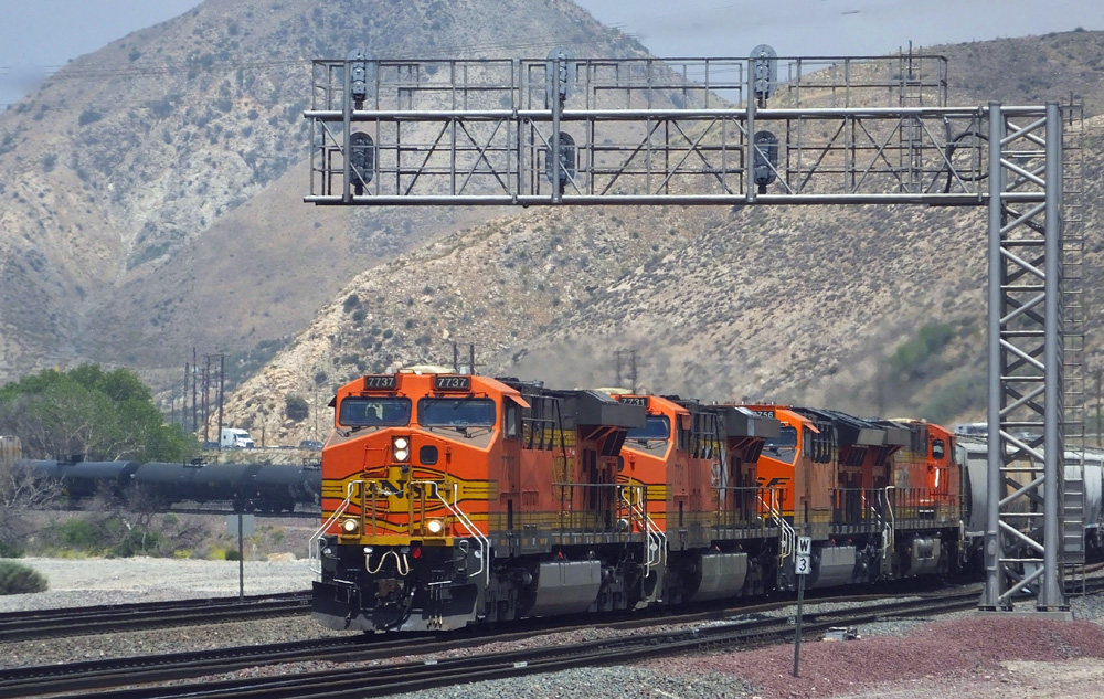 Cajon Pass Interchange. Vier locs van 4400 pk remmen de trein de helling af. Foto: Henk van Joolen, voorjaar 2018.