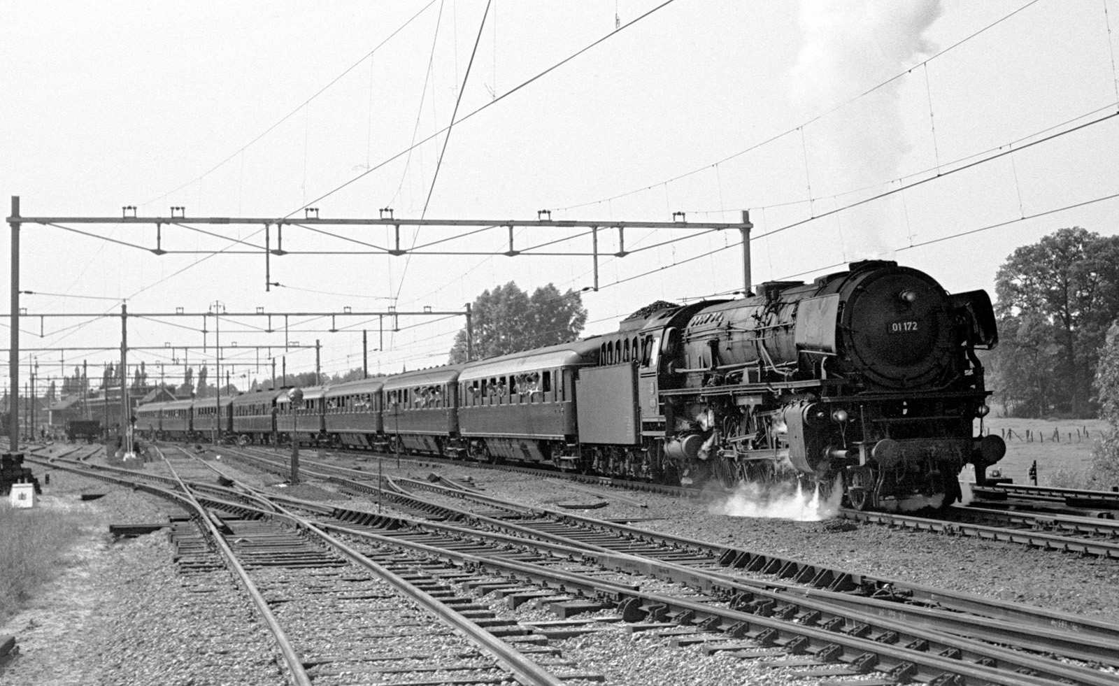 Rijtuigen Plan D in de donderdagse militaire trein 81991 naar Seedorf, getrokken door stoomloc 01 172, bij vertrek uit Oldenzaal op 27 juli 1967. Foto: Roef Ankersmit, collectie NVBS Railverzamelingen.