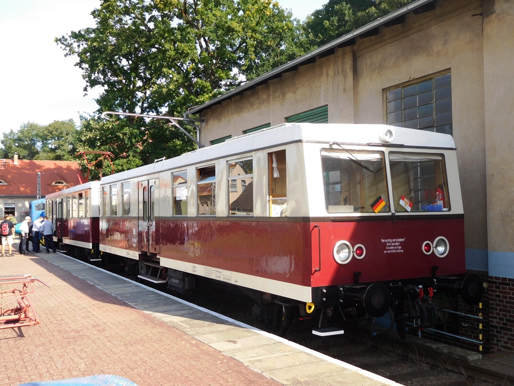De motorwagens van de Buckower Kleinbahn werden oorspronkelijk gebouwd in 1930 maar stammen in hun huidige vorm feitelijk uit 1980. Alleen de nummers en enkele onderdelen zijn hergebruikt. Buckow, 25 september 2016. Foto: Peter Doove.