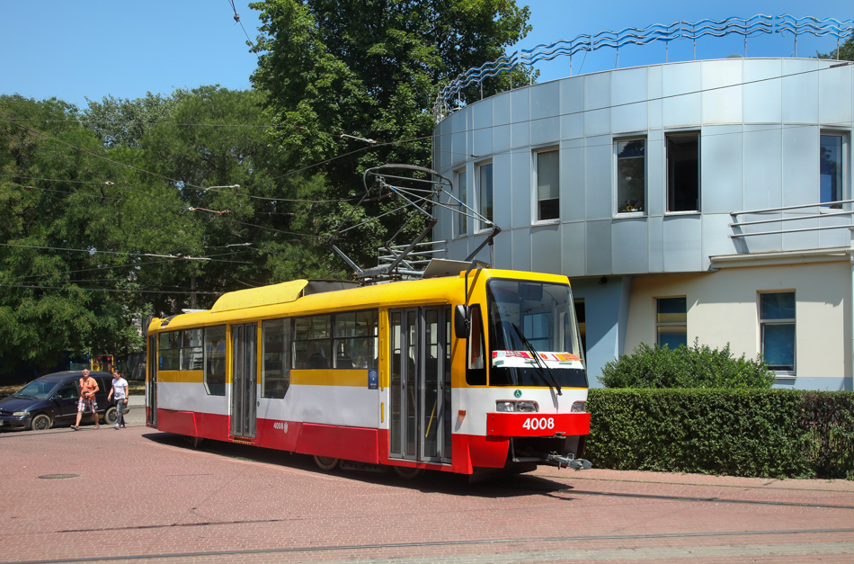 Het trambedrijf van Odessa zet onder meer gemoderniseerde Tatra-motorwagens in. Op 30 juni 2017 staat motorwagen 4008 aan het eindpunt Kulikovo Pole. Foto: Karel Hoorn.
