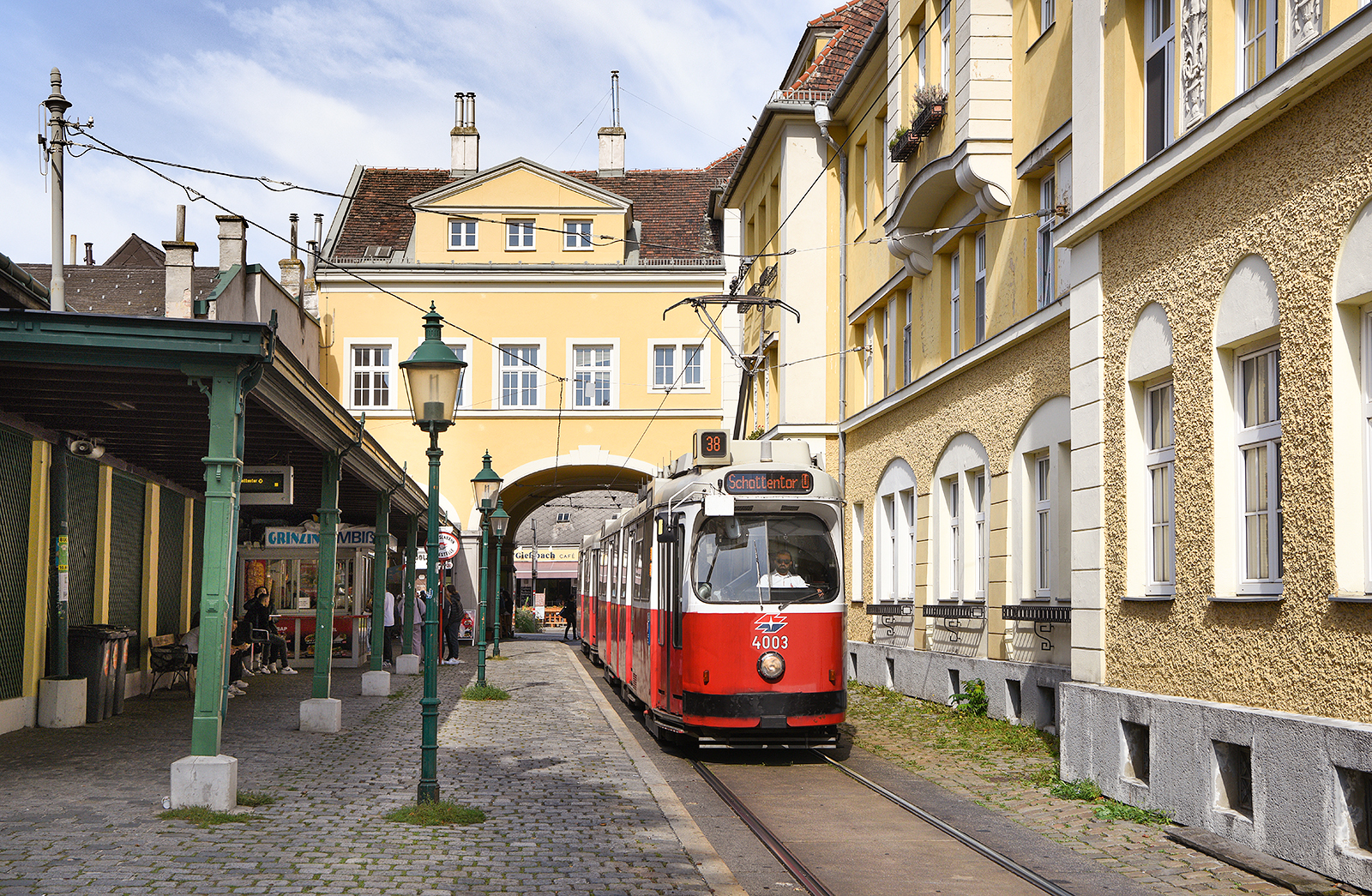 Klassiek beeld met het Weense tramstel 4003+1429 aan het pittoreske eindpunt in het wijndorp Grinzing.