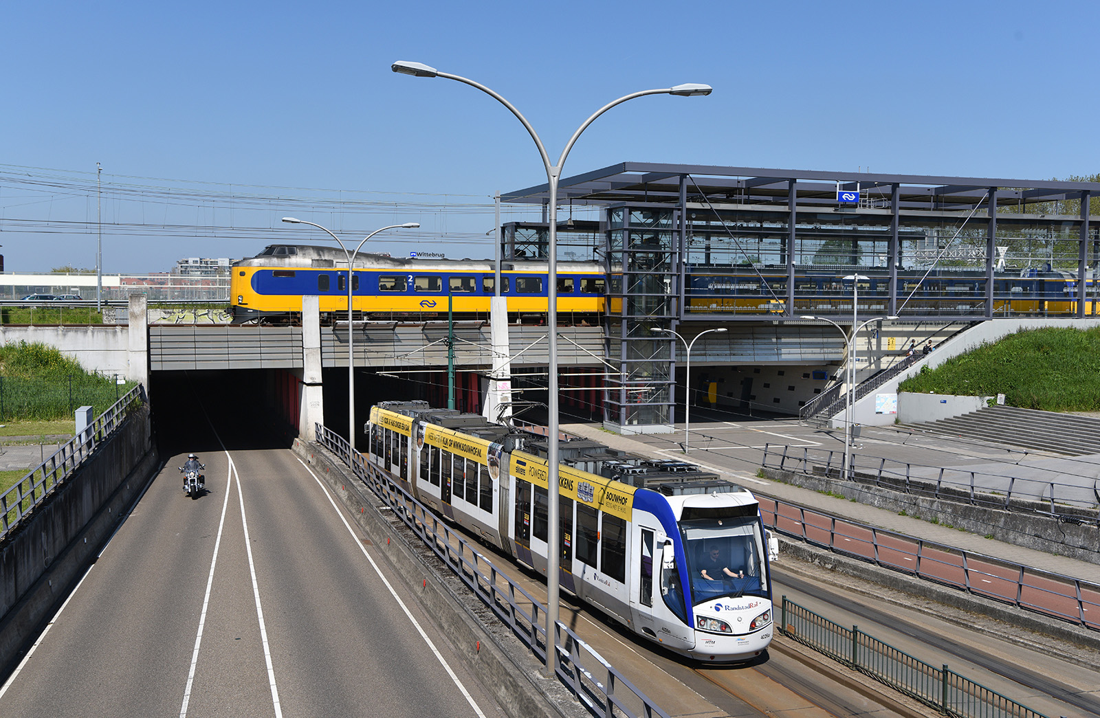 Moderne overstapknoop tussen trein en tram in Den Haag Ypenburg.