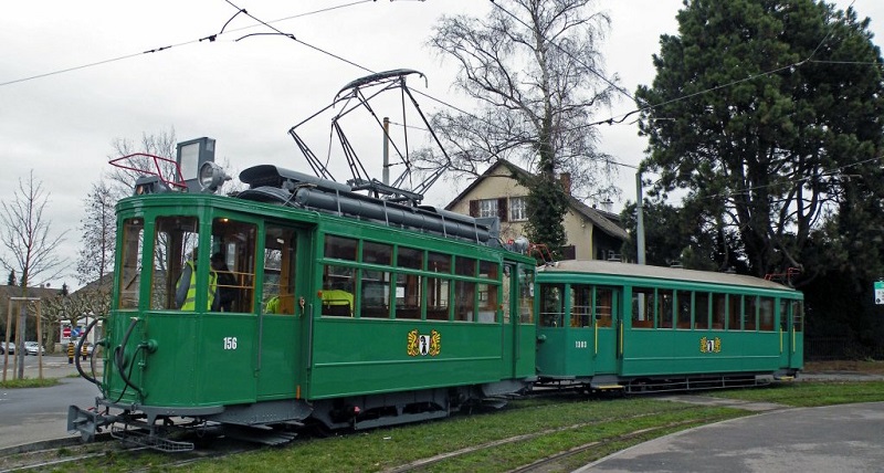 Motorwagen 156 en bijwagen op het tramnet van Basel, 14 januari 2011. Foto: Markus Wagner.