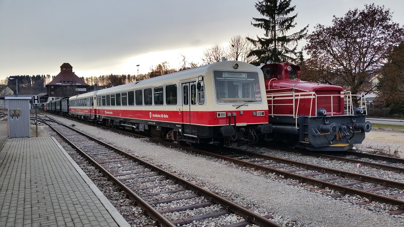 NE 81 van de Schwäbisch Alb-Bahn in het station Münsingen, 20 december 2020. Foto: Triefeline (Wikipedia).