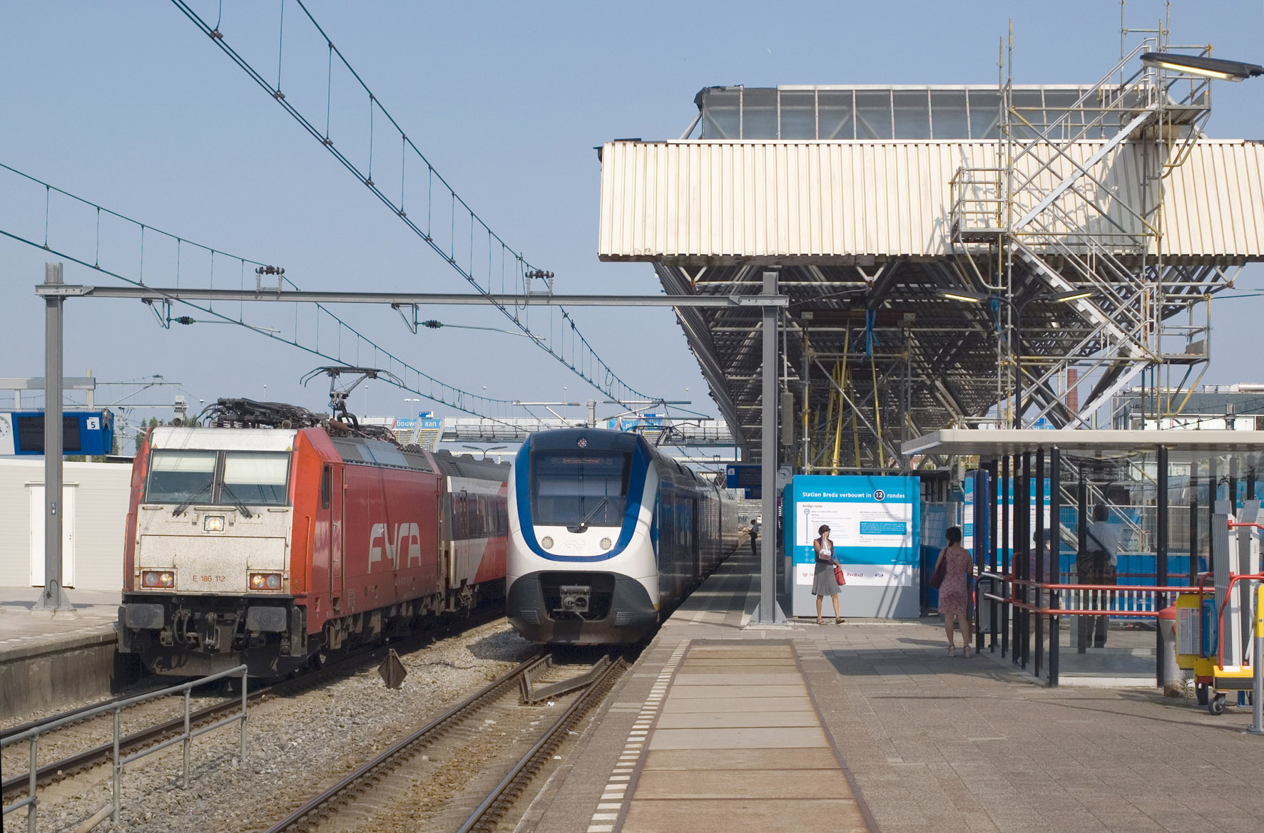 Gezicht op het restant van de overkapping op het eerste perron van het NS-station te Breda. Links: NS, E 186.112, trein Fyra 947 (v. = 16.58 u.), Rechts: NS, 2454, trein Sp. 5058, 15 juli 2013.