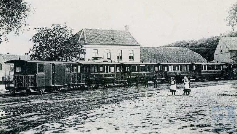 Een lange stoomtram van de NMVB naar Brugge op de Kaai in Aardenburg rond 1910. Bron: SNR.