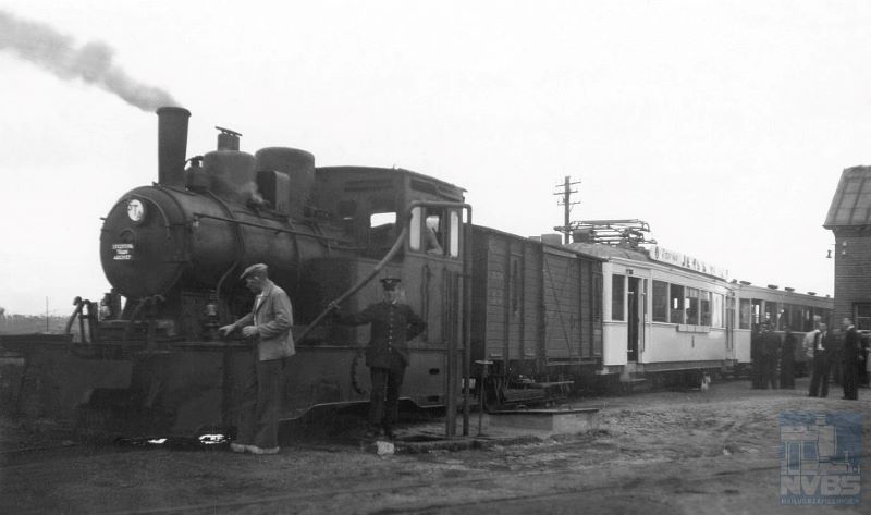 Stoomlocomotief ZVTM 14 met een gesloten goederenwagen en een elektrisch tramstel van de NMVB, tijdens het waternemen in Pyramide op 17 september 1949. Foto: M. van Notten (SNR).