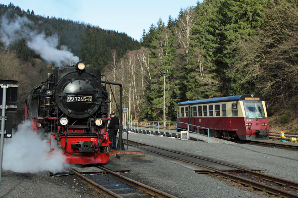 Locomotief 99 7245 en motorwagen 187 018 in Eisfelder Talmühle op 9 februari 2014. Foto: Martin Bos.