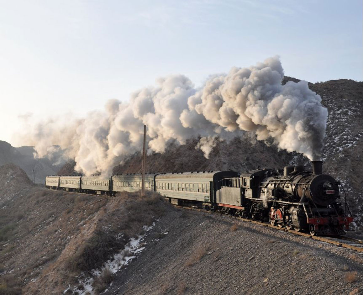In Bayin, in de buurt van de grote stad Lanzhou reden de laatste normaalsporige personentreinen met stoom in de wereld. Hier op 6 december 2012 de SY 1047 met een personentrein. Foto: Bram Stelling.