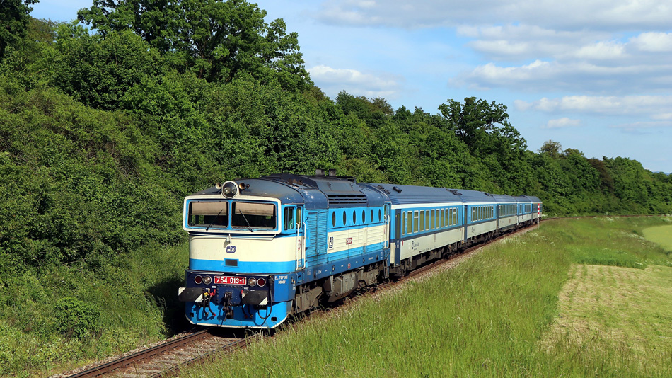 Locomotief 754 013, van het type dat ‘duikbril’ als bijnaam kreeg, zien we ter hoogte van Popovice u Uherského Hradiště in het zuidoosten van Tsjechië op 23 mei 2022.