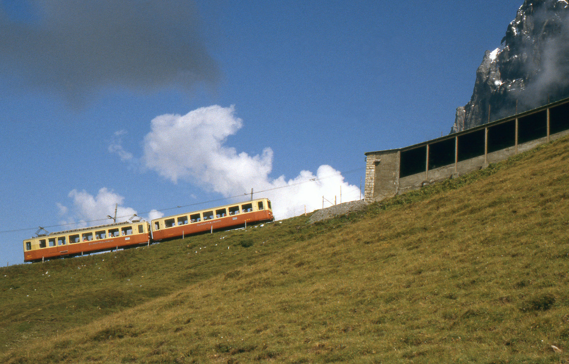 Een Jungfraubahn-treinstel op weg naar Jungfraujoch nadert een lawine-galerij, 30 augustus 2002. Foto: Bert van Diepen.
