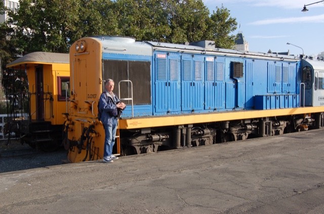 Frits Liebregs op het perron van Dunedin bij de gereedstaande Taieri Gorge-trein.