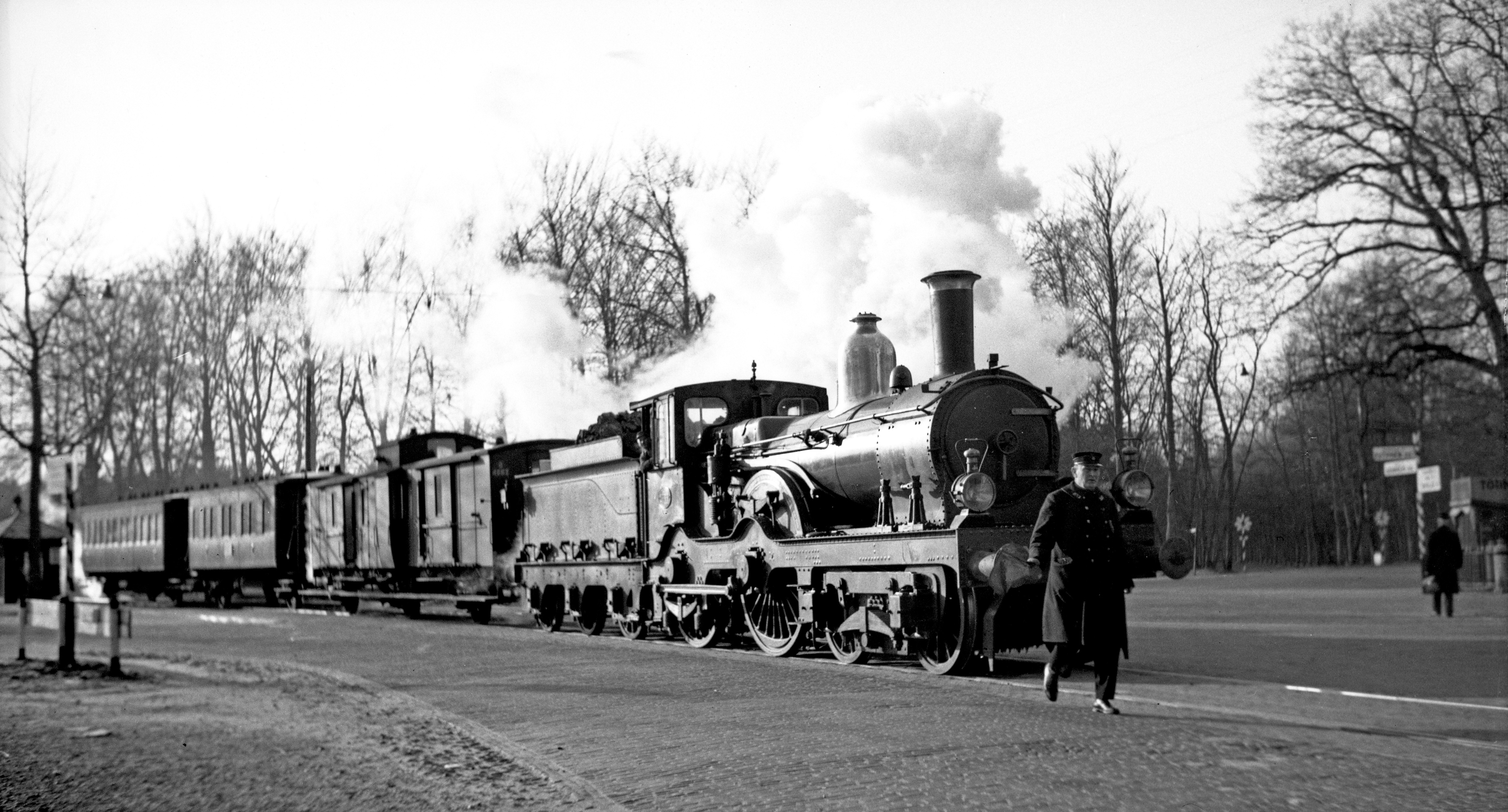 Een trein naar Zwolle passeert omstreeks 1938 de kruising bij de Naald te Apeldoorn Het Loo. Foto: Collectie Onno de Vries.