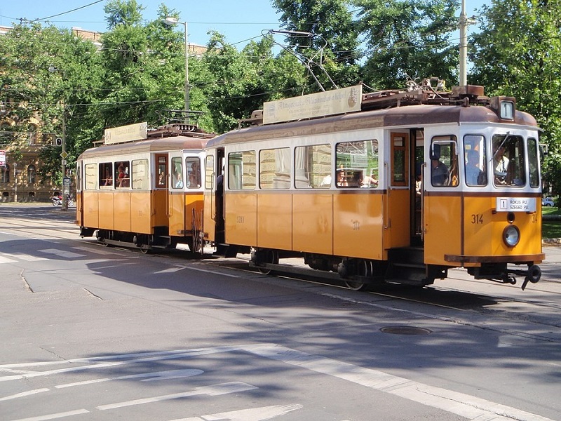 Motorwagens 313 en 314 op het tramnet van Szeged, 28 juni 2008. Foto: Pan Peter.