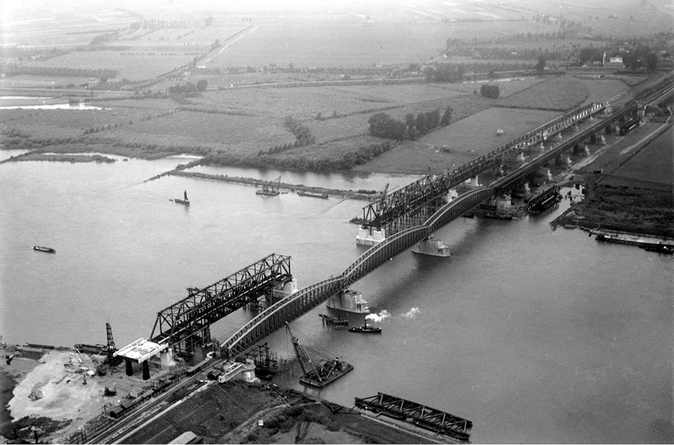 De bouw van de bruggen bij Zaltbommel (1931-1933): verkeersbrug en tweede spoor. Foto: collectie Jan Tromp.