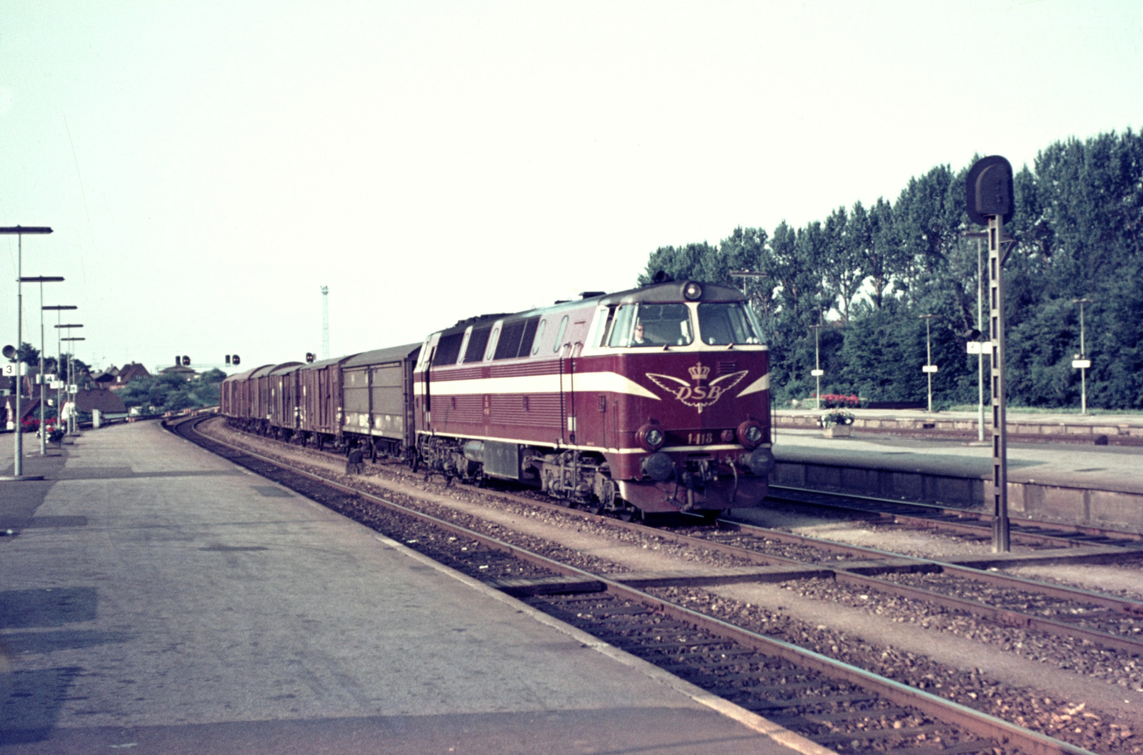Diesellocomotief MZ 1418 van de Deense spoorwegmaatschappij DSB rijdt met een goederentrein door Fredericia; 22 juli 1972. Foto: John Krijgsman.
