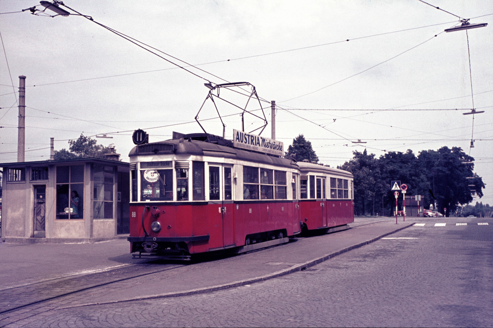 Wenen, Friedrich Engelsplatz, 29 juli 1972. Motorwagen 88 van het type B is met een bijwagen type b onderweg op lijn 11 naar Stadlauer Brücke. De bijwagen had als bijnaam ‘Zischer’ wegens de pneumatische schuifdeuren. Foto: John Krijgsman.