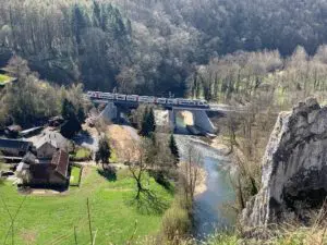 ![]() Spoorbrug over de Lesse bij Chaleux in de Ardennen met een lokaaltrein van Libramont naar Namen vanaf het hoogste punt van de 2e wandeling, 3 april 2022. Foto: Ronald Bokhove. |