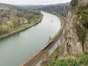 ![]() Zicht op de Maas en de spoorlijn Namen – Luik bij Marche-les-Dames waar op 1 april 2022 een tweewagenstel van de serie MS CR passeert. Foto: Ronald Bokhove. |