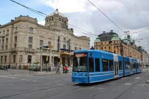 Een tram voor het theater in Stockholm, 10 augustus 2018. Foto Karel Koploper