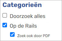 Bij de categorie Op de Rails zie je ook de knop tekst doorzoeken. Deze functie staat standaard aan. Dit betekent dat alle artikelen volledig worden doorzocht. Schakel je deze functie uit, dan wordt er alleen gezocht door titels, trefwoorden en auteursnamen. Zoek je bijvoorbeeld op Hilversum, dan krijg je alleen artikelen te zien die over Hilversum gaan. Als tekst doorzoeken aanstaat, dan vind je ook alle andere artikelen waarin het woord Hilversum voorkomt.