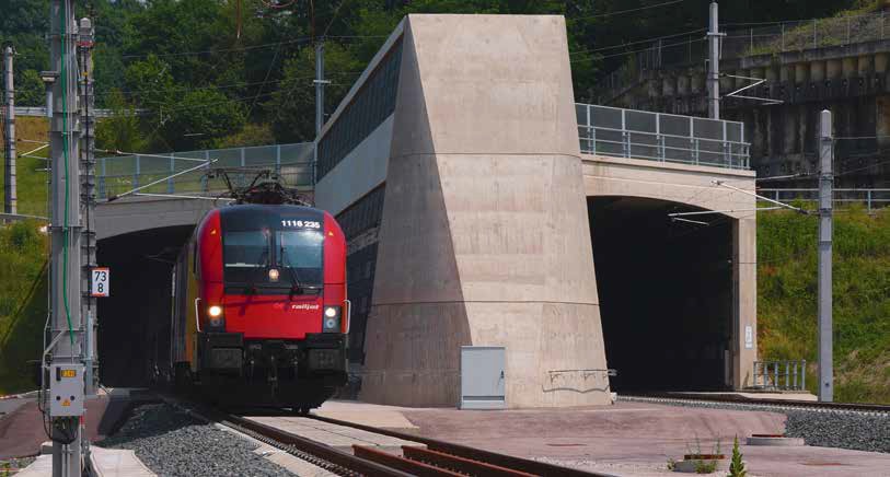 Taurus-locomotief 1116 235 komt tijdens een testrit met een Railjet Express-garnituur tevoorschijn uit het Karinthisch portaal van de Koralm-basistunnel. Rechtsboven is te zien hoe de Lavanttalbahn naar Wolfsberg over de tunnelmonding is geleid. | 2025