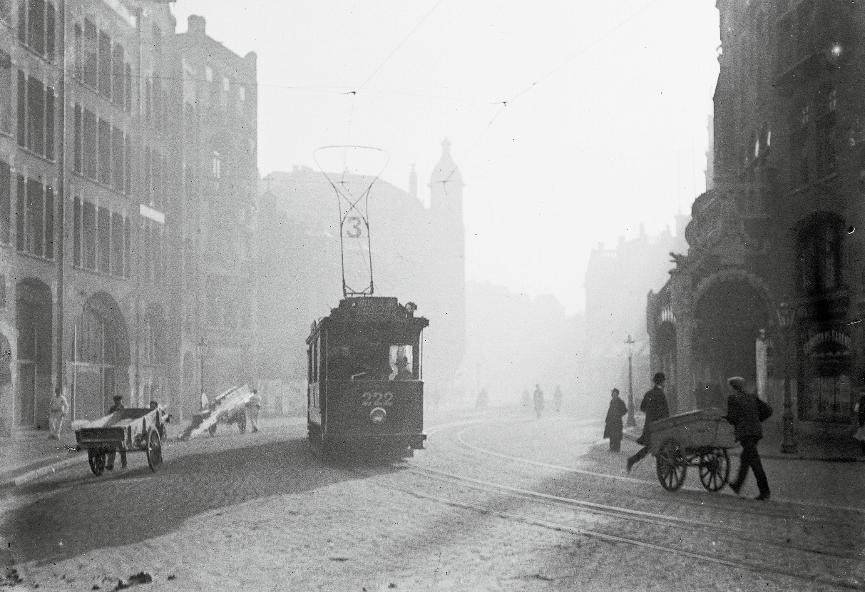 Een nevelige ochtend in de Raadhuisstraat, de zon breekt door en lijn 3 komt eraan. Een bekende foto van Bernard Eilers, gemaakt tussen 1907 en 1910. Eilers hield van ‘zeurige’ winterdagen met mist, regen of sneeuw om met zijn camera de ziel van de stad te vangen.