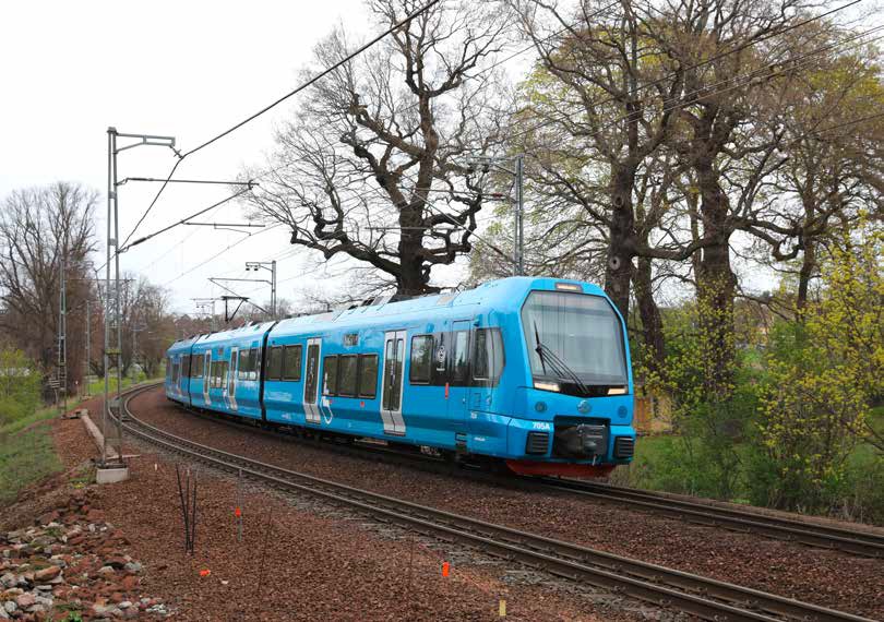 Een van de nieuwe Stadler-treinstellen onderweg op het gemeenschappelijke traject van de drie lijnen bij Stocksund. | 28-04-2025
